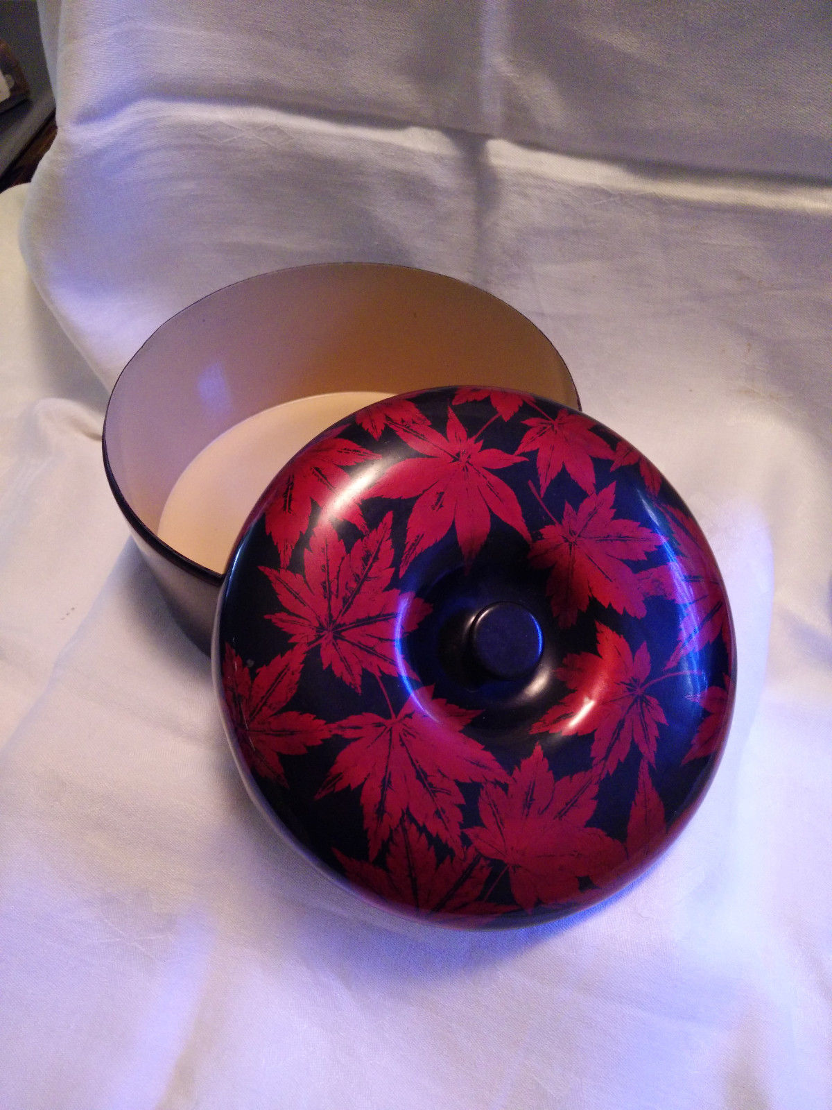 Title (ebay affiliate link): Antique Basuni Lacquerware Occupied Japan Round Box Red Maple Leaf Metal Base