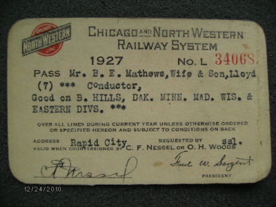 CHICAGO & NORTH WESTERN RAILWAY 1927 PASS B. MATHEWS
