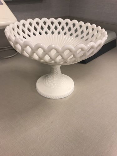 Title (ebay affiliate link): VINTAGE LACE EDGE / BASKET WEAVE BASE PEDESTAL MILK GLASS DISH