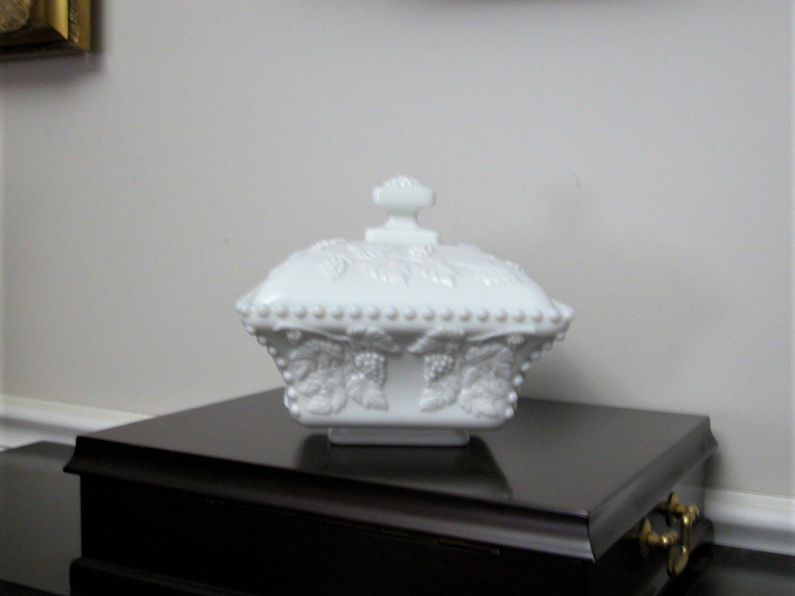 Title (ebay affiliate link): Westmoreland Beaded Paneled Grape Large Square Dish Covered Compote Milk Glass