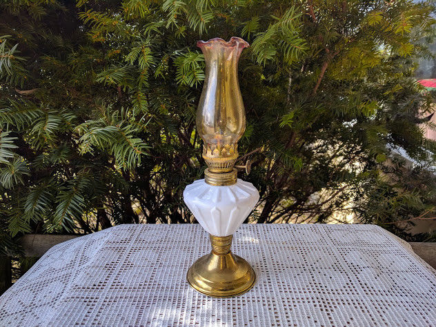 Title (ebay affiliate link): White milk glass mini oil lamp vertical lines brass base colored glass chimney