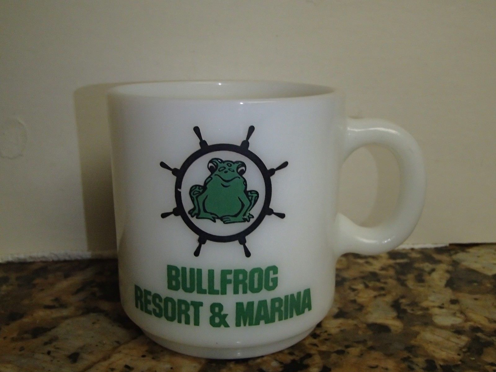 Title (ebay affiliate link): Vintage Green Bullfrog Resort and Marina White Milk Glass Mug Lake Powell
