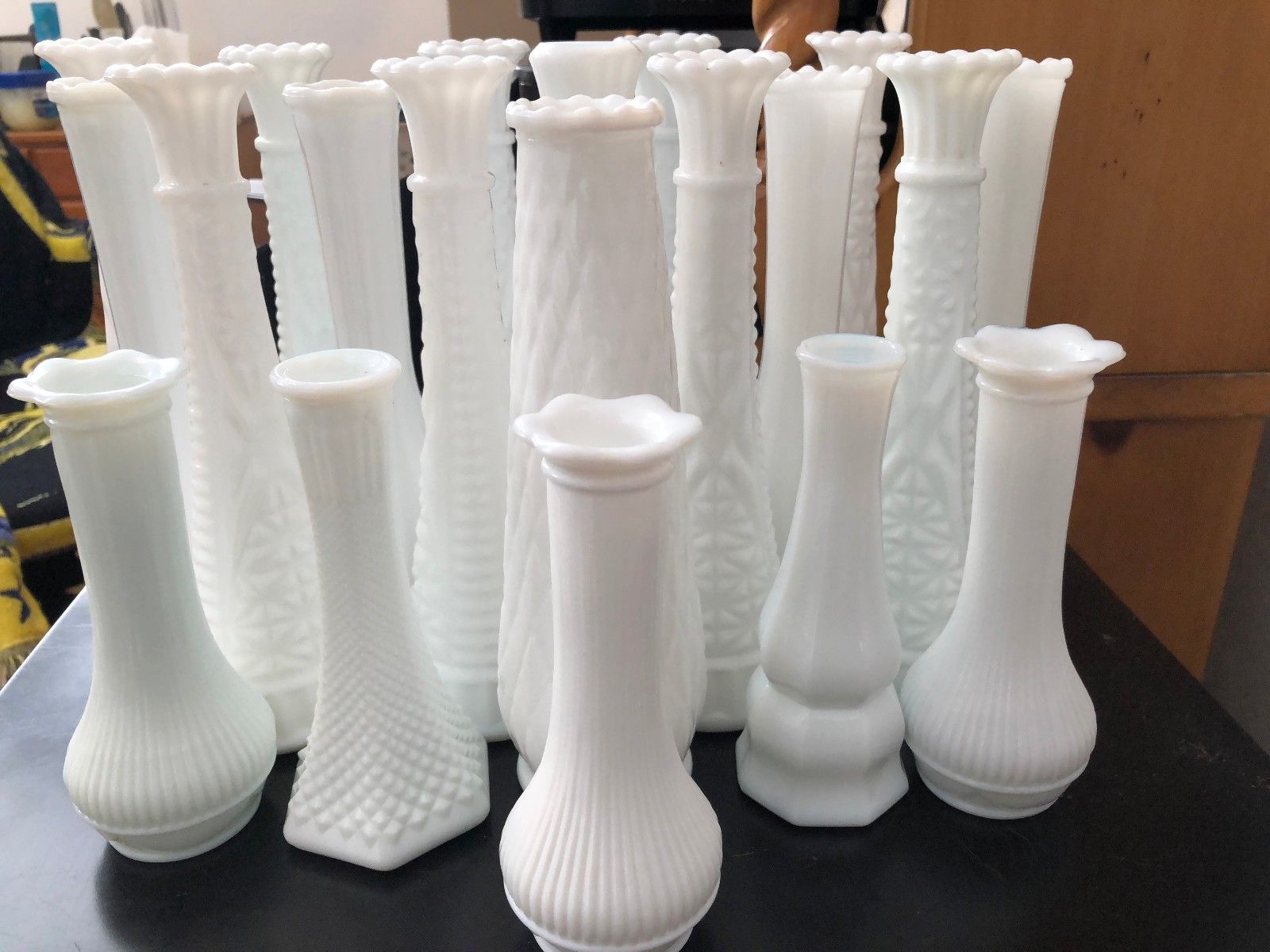 Title (ebay affiliate link): Fabulous VTG 20-PC Lot of White Milk Glass Wedding Party Florist Bud Vases 6"-9"