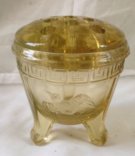 Title (ebay affiliate link): Vintage Depression Vaseline Glass Greek Key And Birds Vase Urn With Flower Frog