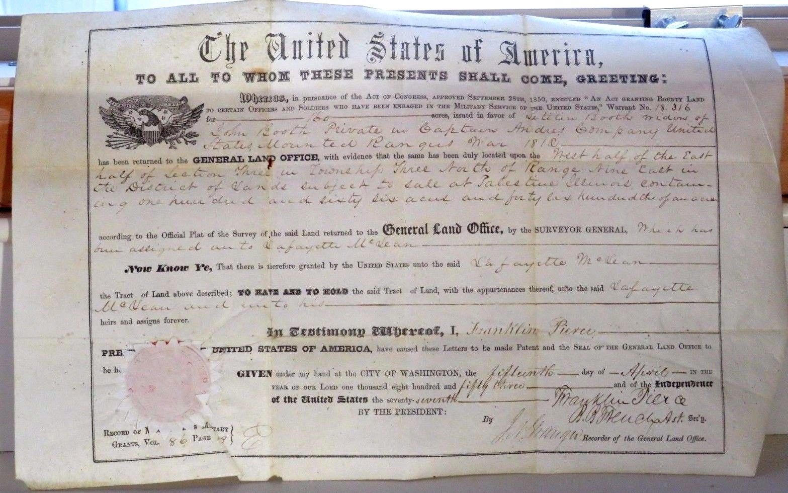 Title (ebay affiliate link): Land Grant-War of 1812-Secretary Signed for President Franklin Pierce-1853
