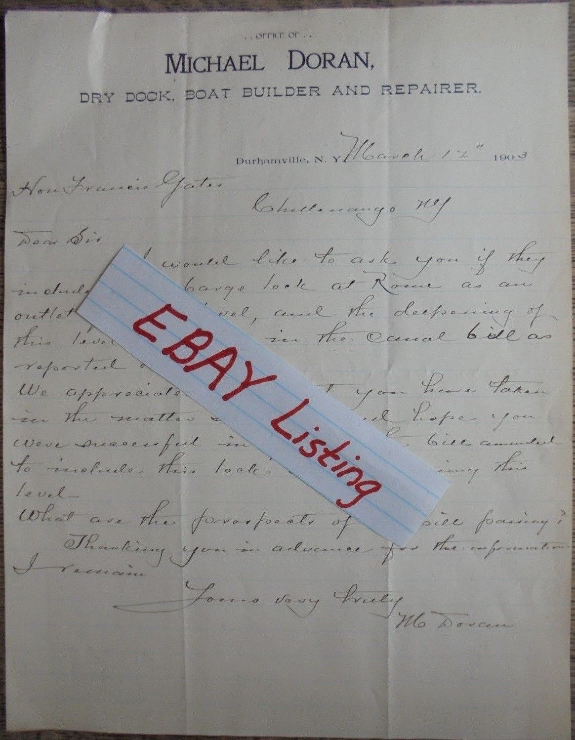 Historical ERIE CANAL Papers N.Y.Senator''s Letter MICHAEL DORAN Boat Builder