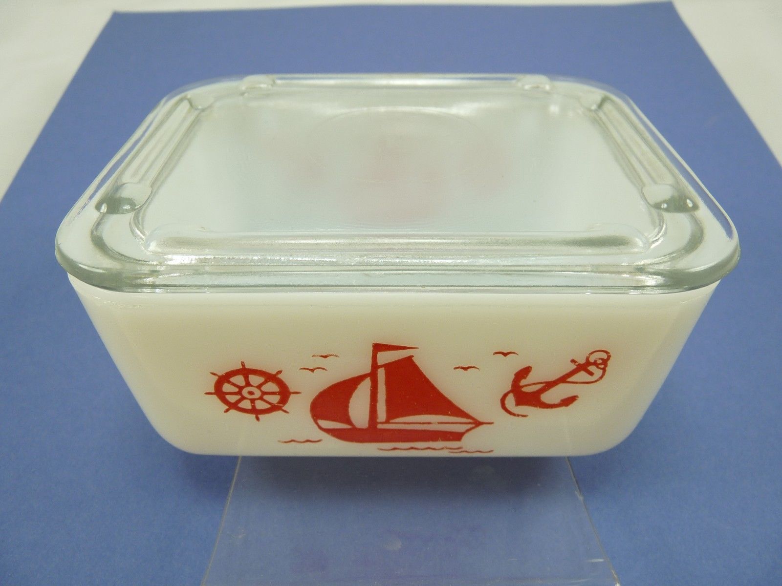 Title (ebay affiliate link): Vintage McKee Refrigerator Dish Milk Glass Red Sailboat With Lid