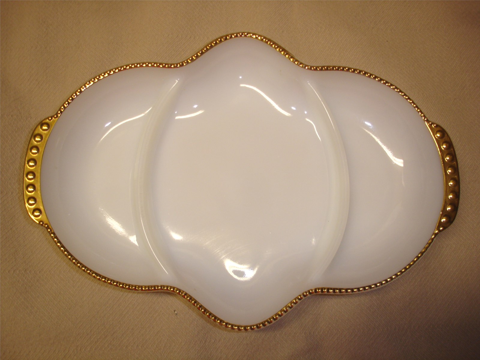 Vintage Fire-King Oven Ware Divided Dish - White Milk Glass with Gold Trim