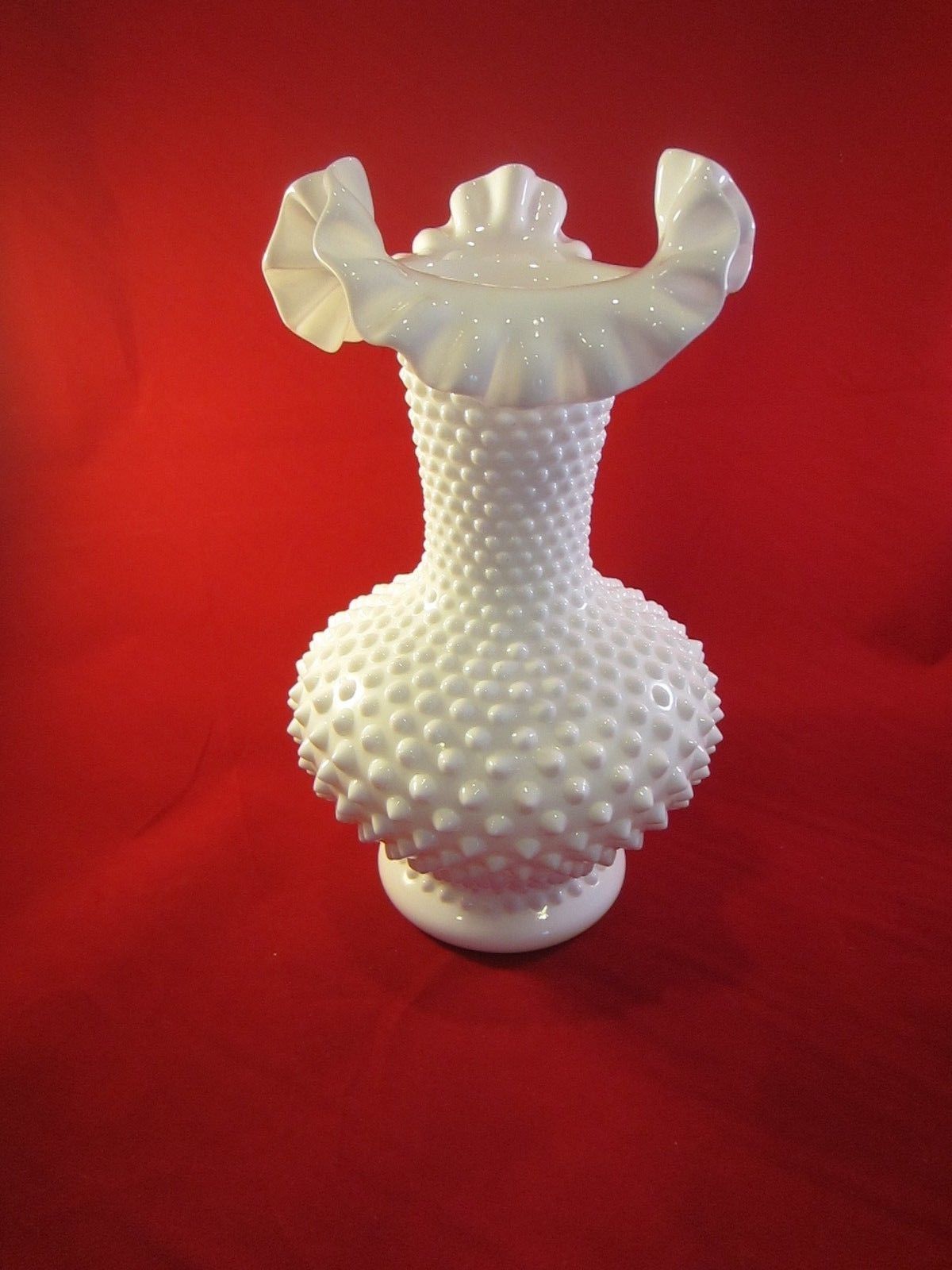 Title (ebay affiliate link): FENTON WHITE MILK GLASS HOBNAIL 11" PEDESTAL VASE FLUTED RUFFLED EDGE