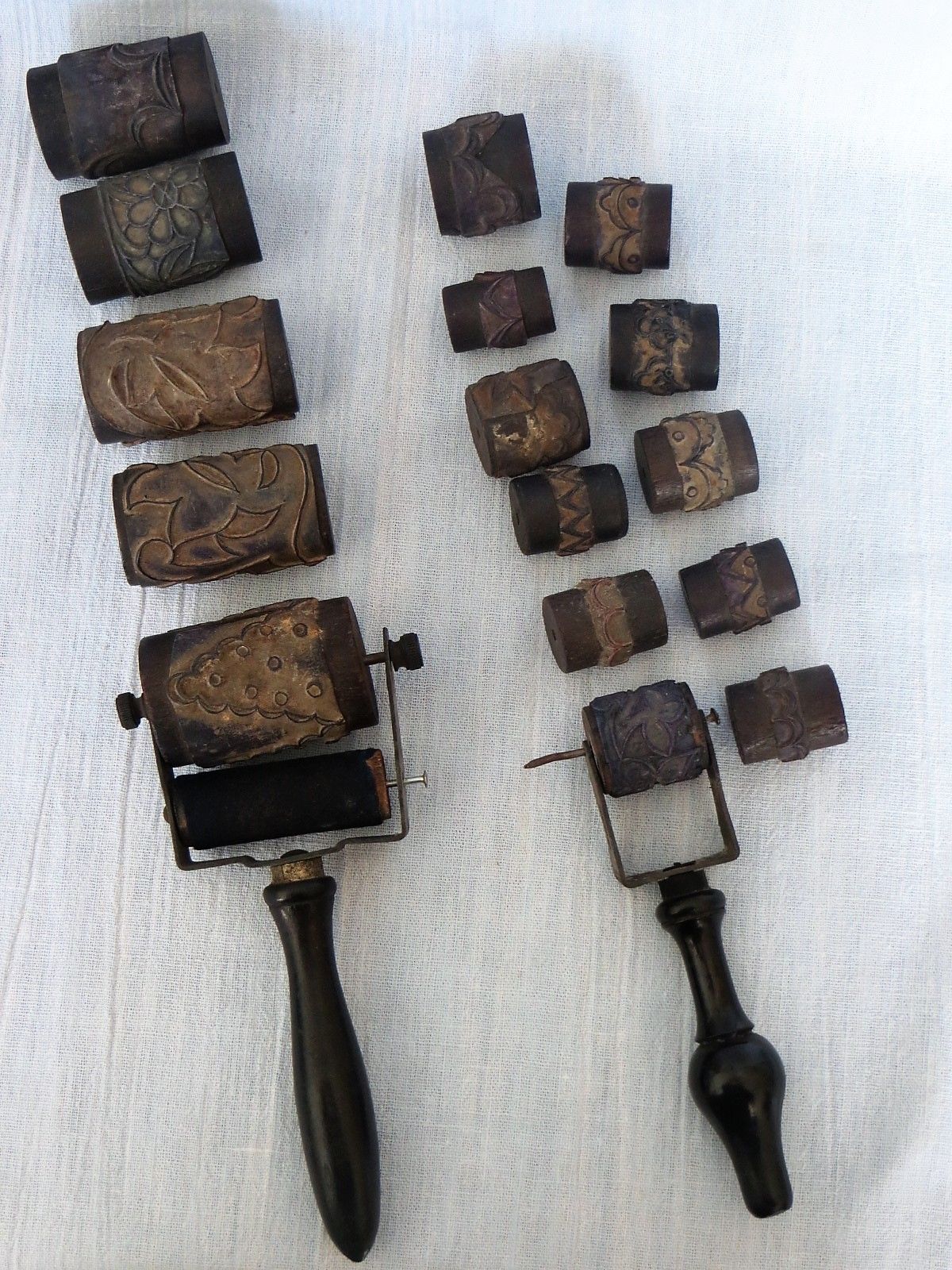Title (ebay affiliate link): ANTIQUE FRENCH WOODEN PRINT ROLLERS 1 1/4" & 2" Lots of Designs fabric or paper