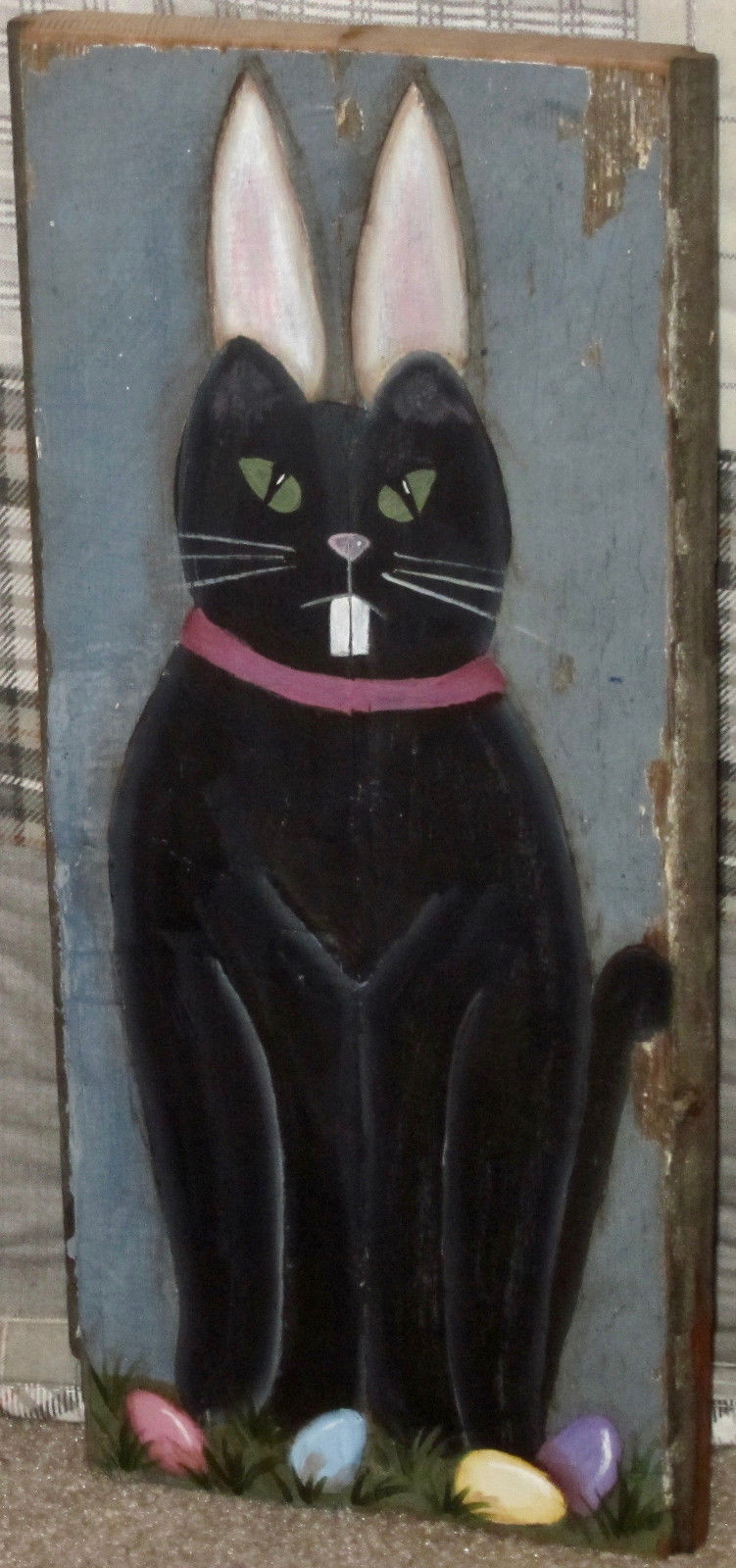 Title (ebay affiliate link): *~*PRIMITIVE*~* HP FOLK ART PRIM BLACK CAT BUNNY *~* EGG *~* OLD RECLAIMED WOOD
