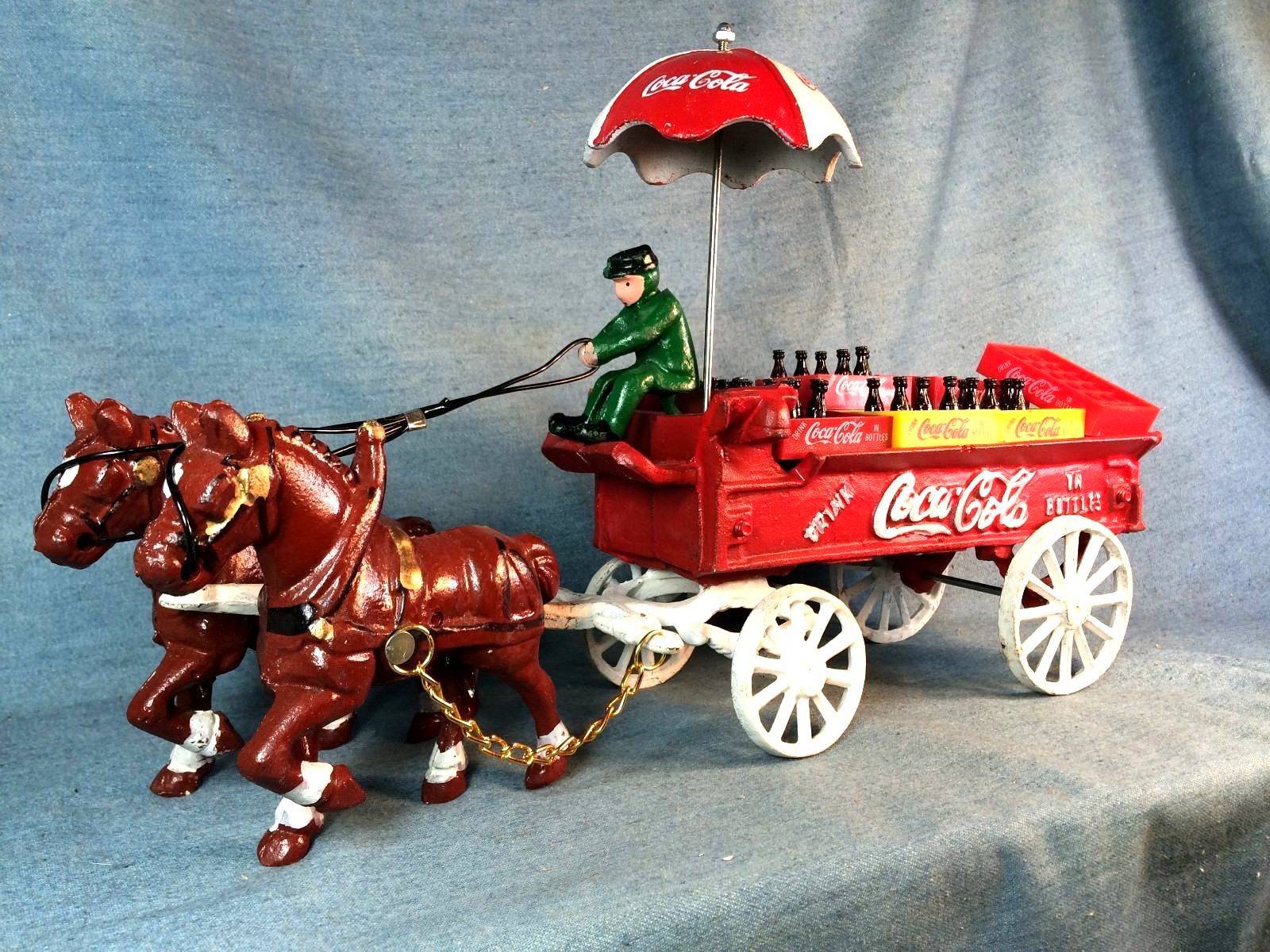 Title (ebay affiliate link): 15 INCH CAST IRON COCA COLA DELIVERY WAGON WITH BOX HORSES DRIVER CASES BOTTLES