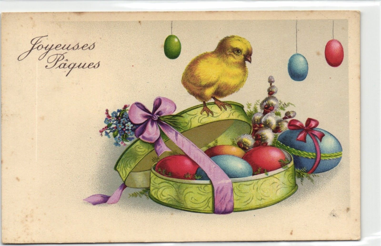 Easter chick on gift box with eggs French artist postcard 1940''s