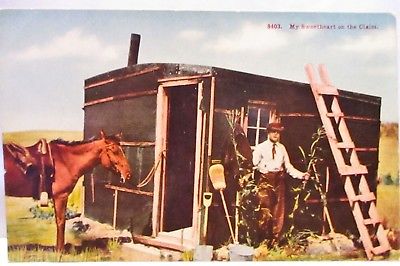 Title (ebay affiliate link): 1910 POSTCARD MY SWEETHEART ON THE CLAIM, MAN WITH HORSE IN PRAIRE SHACK