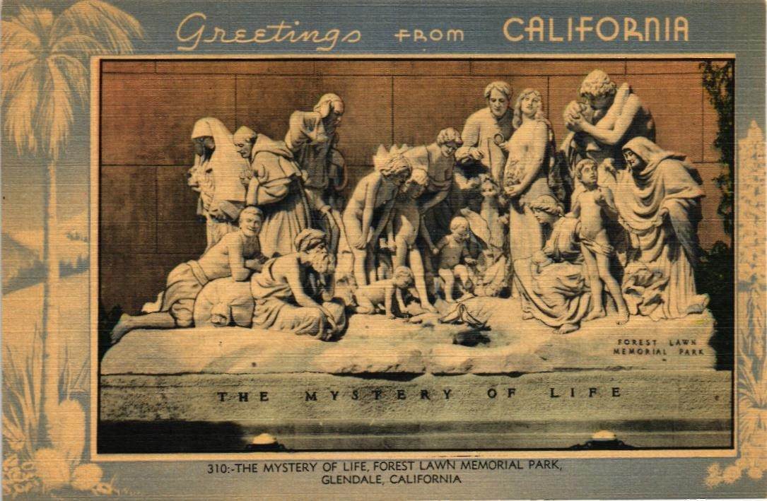 DR JIM STAMPS US MYSTERY OF LIFE FOREST LAWN GLENDALE CALIFORNIA LINEN POSTCARD