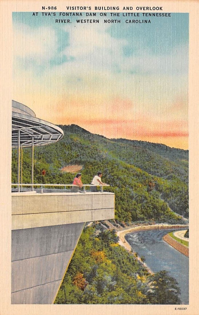 Title (ebay affiliate link): VISITOR''S BLDG AND OVERLOOK, AT TVA''S FONTANA DAM, NC. LINEN CARD, C028367