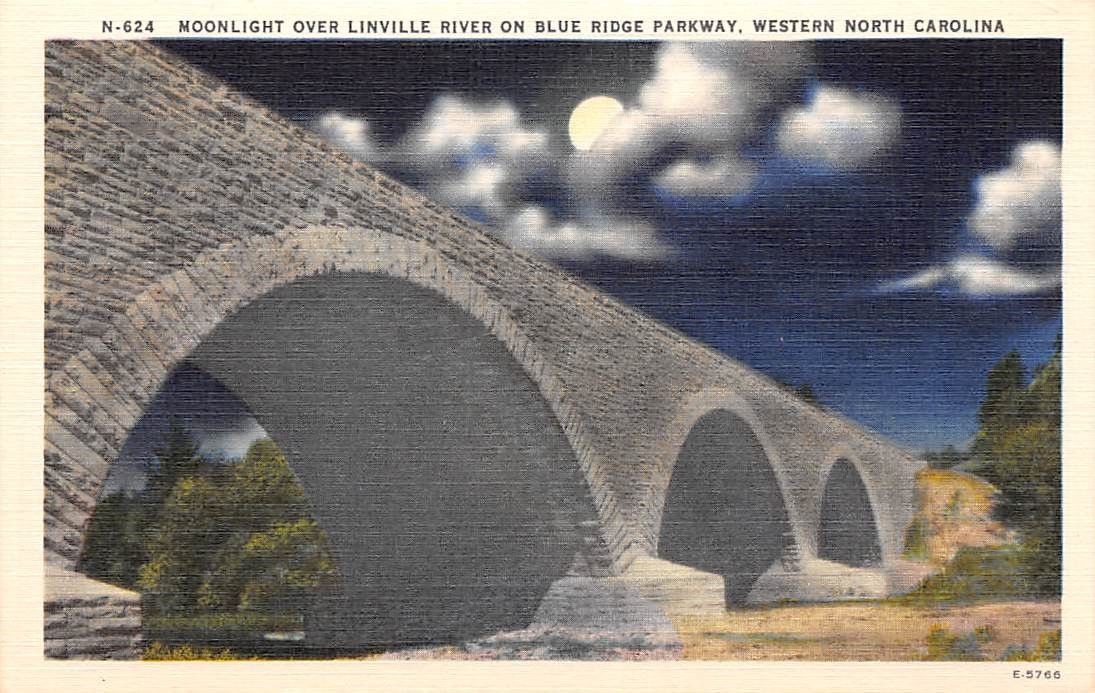 Title (ebay affiliate link): MOONLIGHT OVER LINVILLE RIVER ON BLUE RIDGE PARKWAY, NC. LINEN CARD, C028379