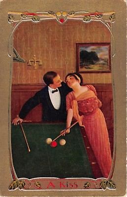 Title (ebay affiliate link): Lovers Taking a Kiss While Playing Pool or Billiards on Old Romantic Postcard
