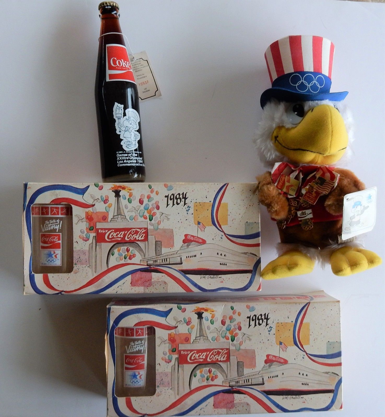 Title (ebay affiliate link): COCA COLA 1984 OLYMPIC GAMES RARE BOTTLE, GLASSES, PINS & SAM THE EAGLE SET