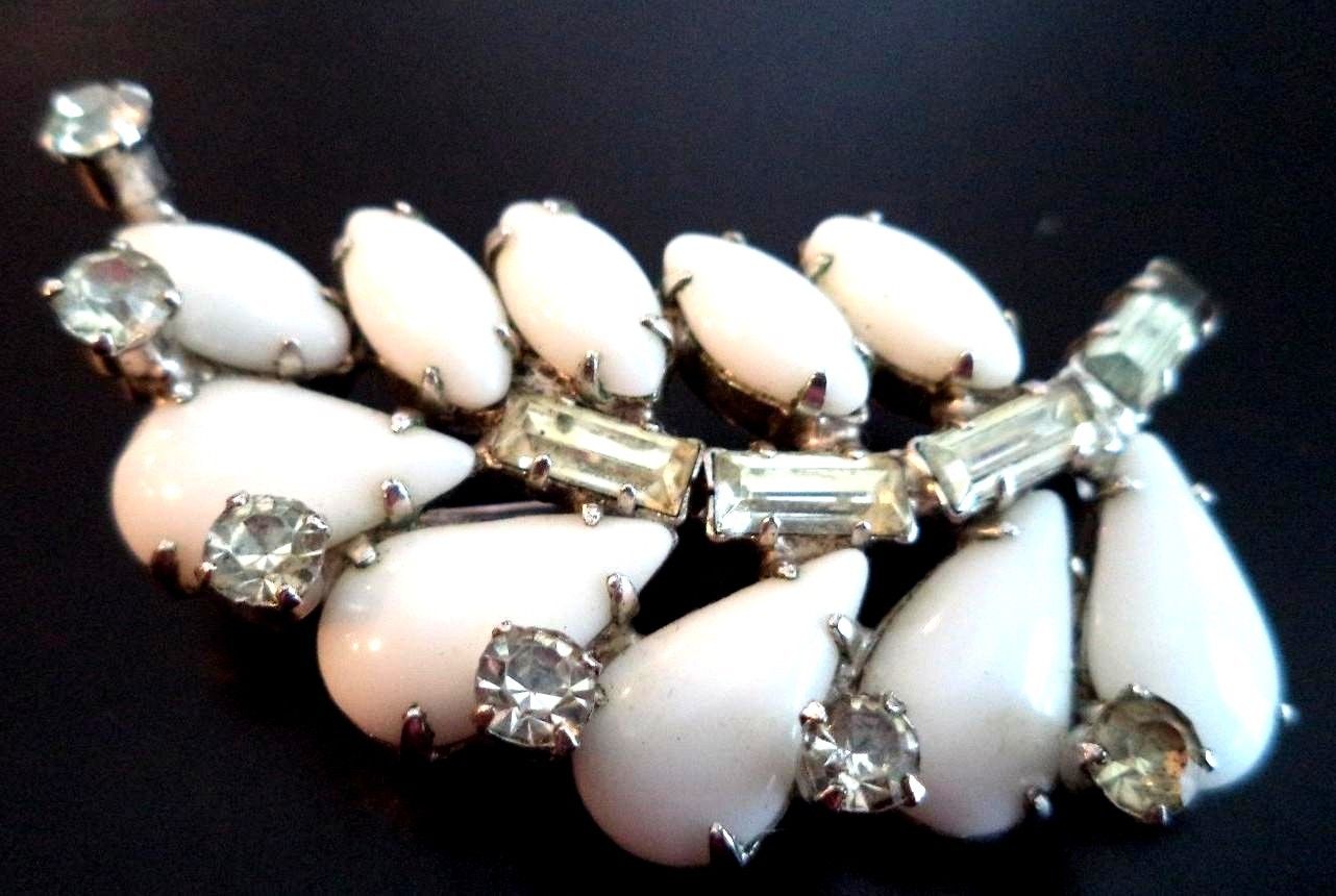 Title (ebay affiliate link): VINTAGE ESTATE HIGH END MILK GLASS RHINESTONE FLOWER 1 3/4" BROOCH!!! G6761O