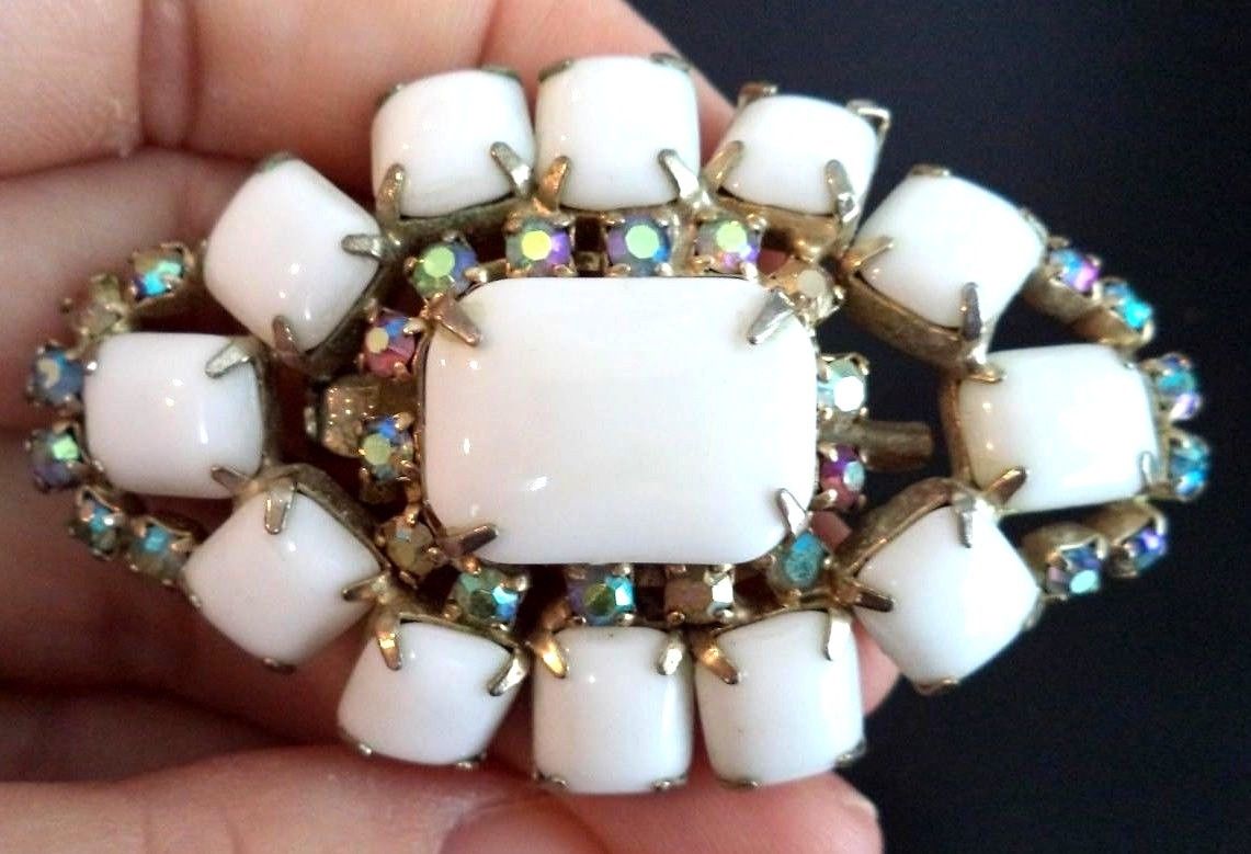 Title (ebay affiliate link): VINTAGE ESTATE HIGH END MILK GLASS AB RHINESTONE FLOWER 2 3/8" BROOCH!!! G6761X
