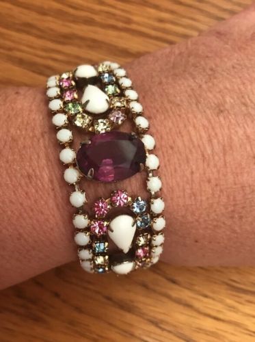 Title (ebay affiliate link): Vintage Milk Glass Pastel Rhinestone High End Bracelet Weiss? Gold Tone