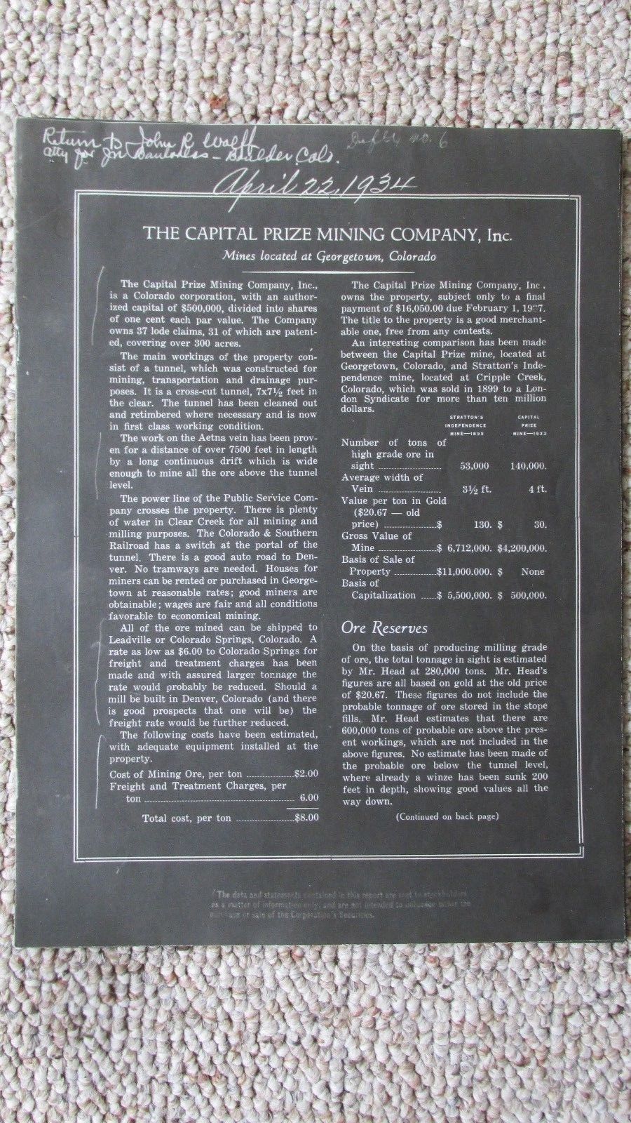 Title (ebay affiliate link): 1917 Georgetown Colorado Capital Prize Mine Prospectus 1934 Shareholder Copy-