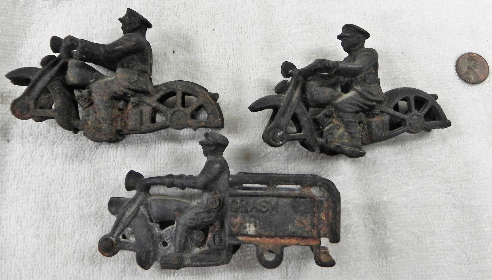Lot of Three Small Cast Iron Toy Antique Motorcycles Crash Car USA