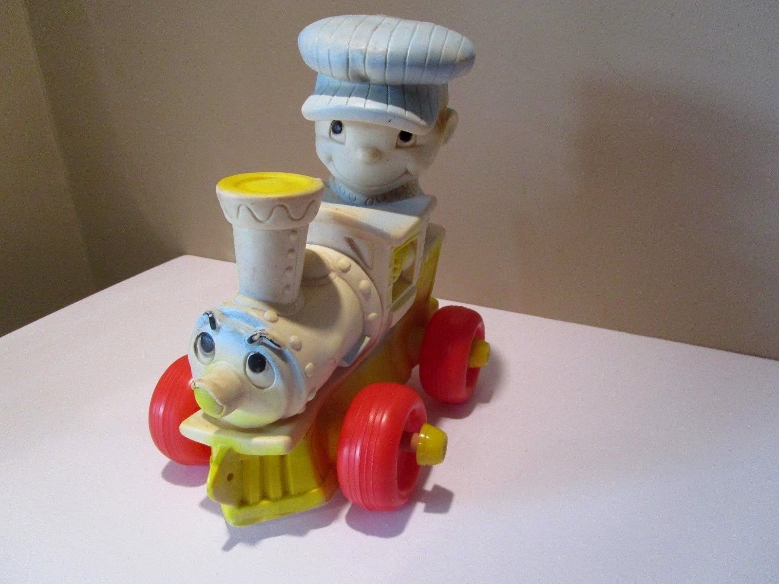 Title (ebay affiliate link): VINTAGE SQUEAK TOY EDWARD MOBLEY CO ARROW RUBBER & PLASTIC Train Engineer 75