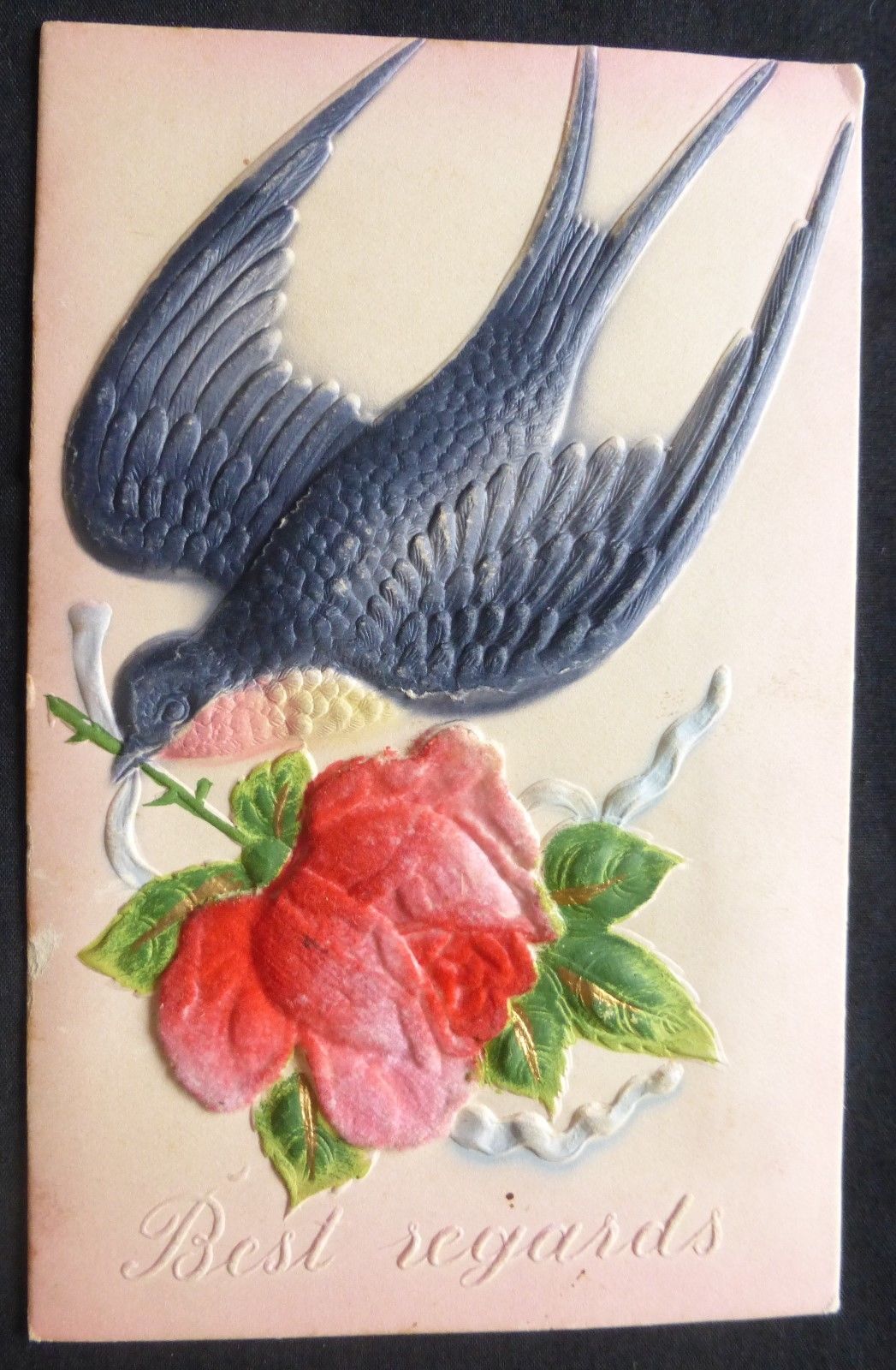 Title (ebay affiliate link): PC VINTAGE "Best Regards" Heavy Embossed Beautifull color Bird / Rose #8369