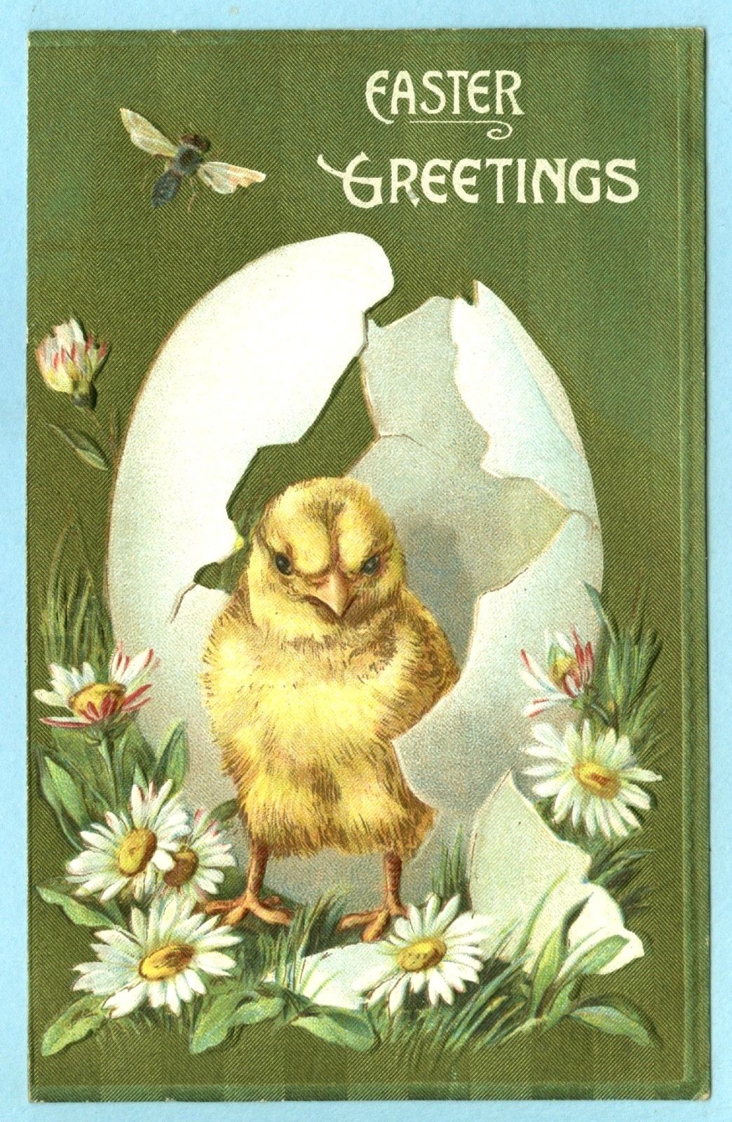 Title (ebay affiliate link): Embossed, "Easter greetings", Baby Chick Popping Out of His Egg, Seeing Daisies