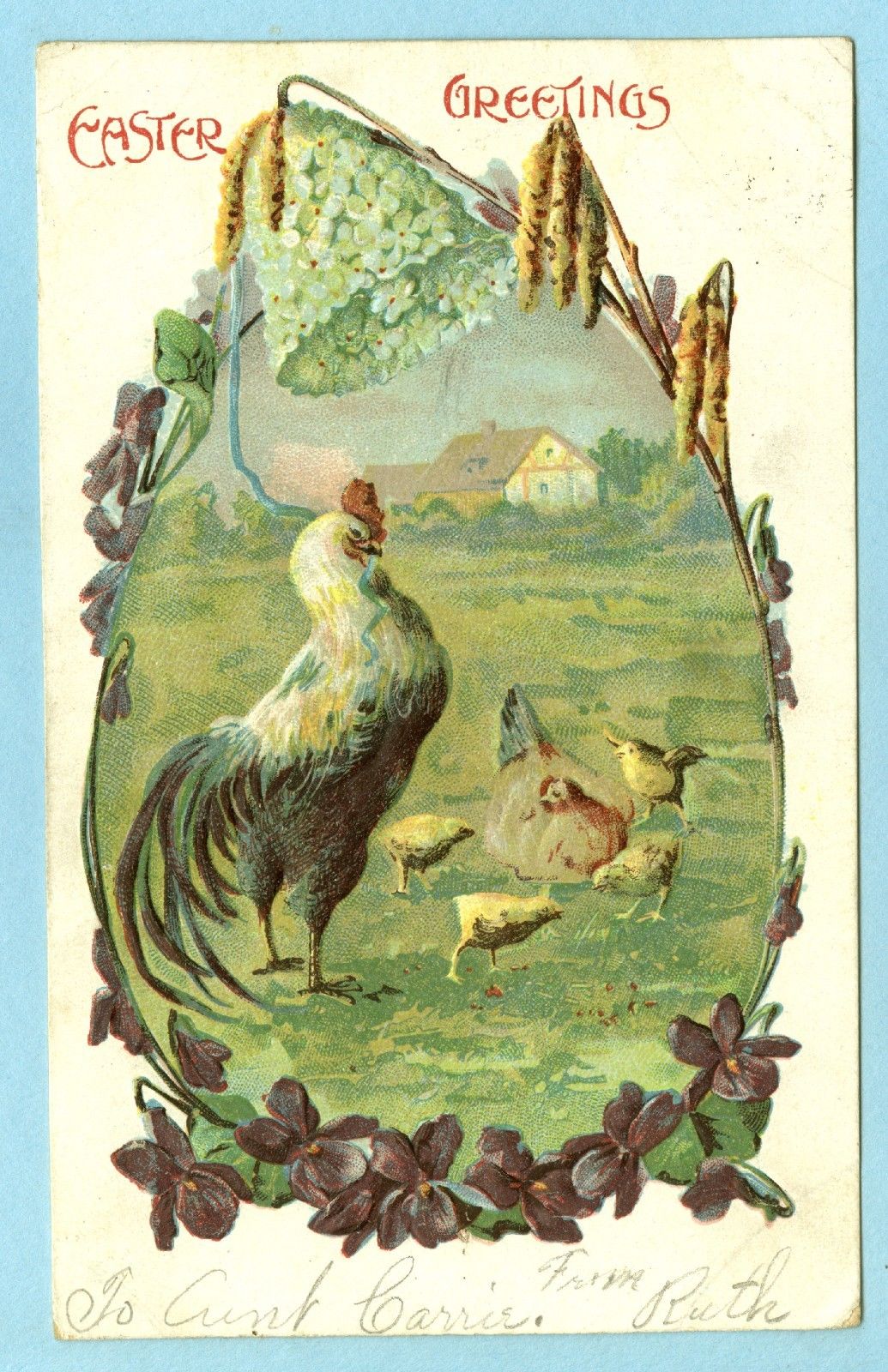 Title (ebay affiliate link): Embossed, "Easter Greetings", Rooster & Hid Hen and Chicks in Farm Yard, Flowers