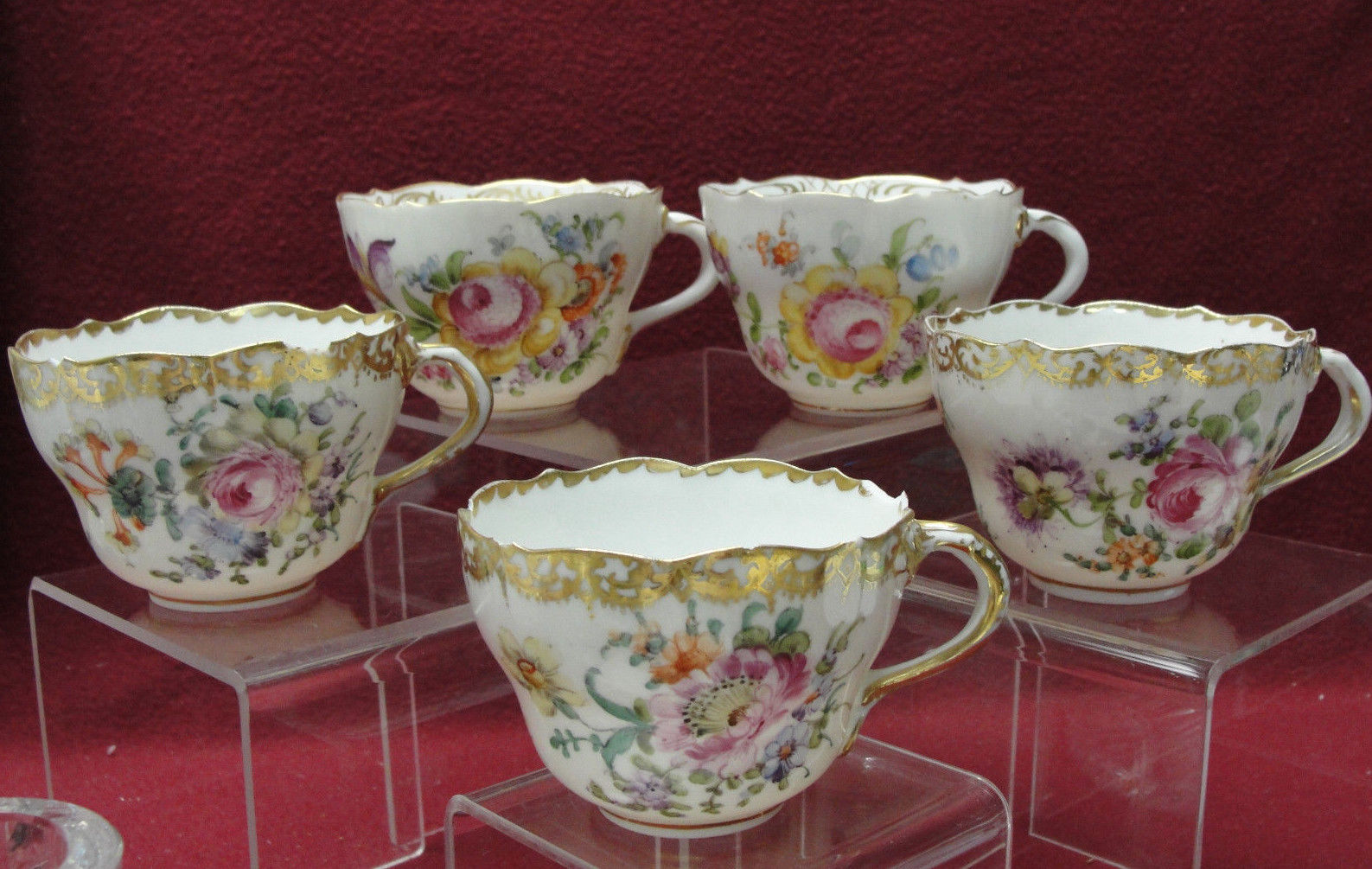 Title (ebay affiliate link): Five (5) Antique DRESDEN Porcelain Dresden Flowers TEACUPS - circa 1900 *as is*