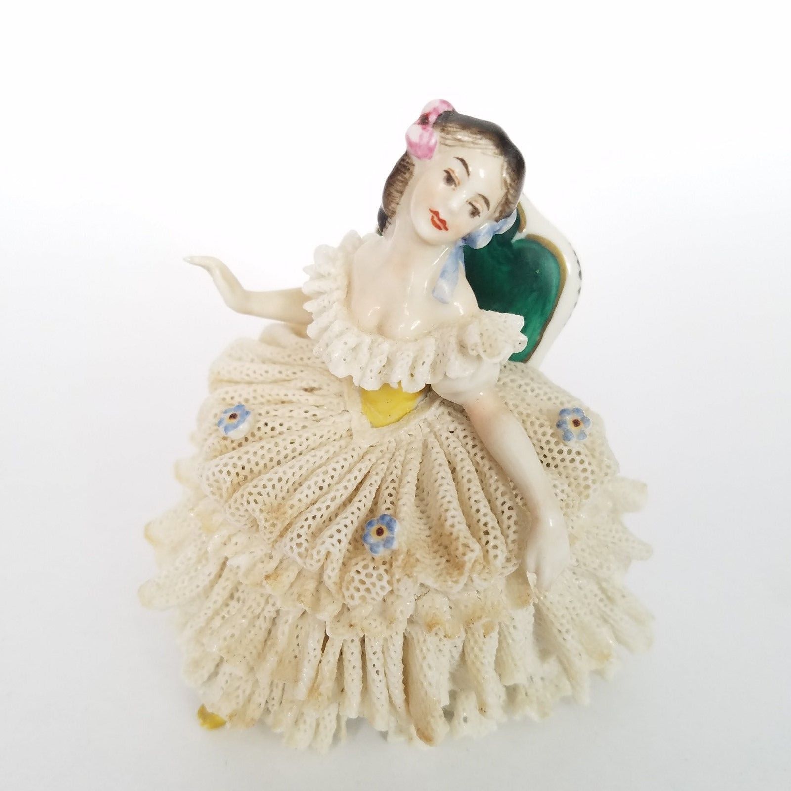 Title (ebay affiliate link): Antique Dresden Lace VOLKSTEDT Germany porcelain figurine Lady Sitting on Chair