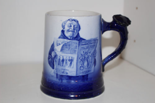 Title (ebay affiliate link): ANTIQUE COBALT BLUE/WHITE PORCELAIN MONK/FRIAR READING PAPER MUG/STEIN/TANKARD
