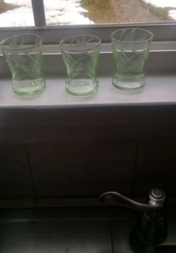 Title (ebay affiliate link): 3 matching green depression floral etched shot glasses