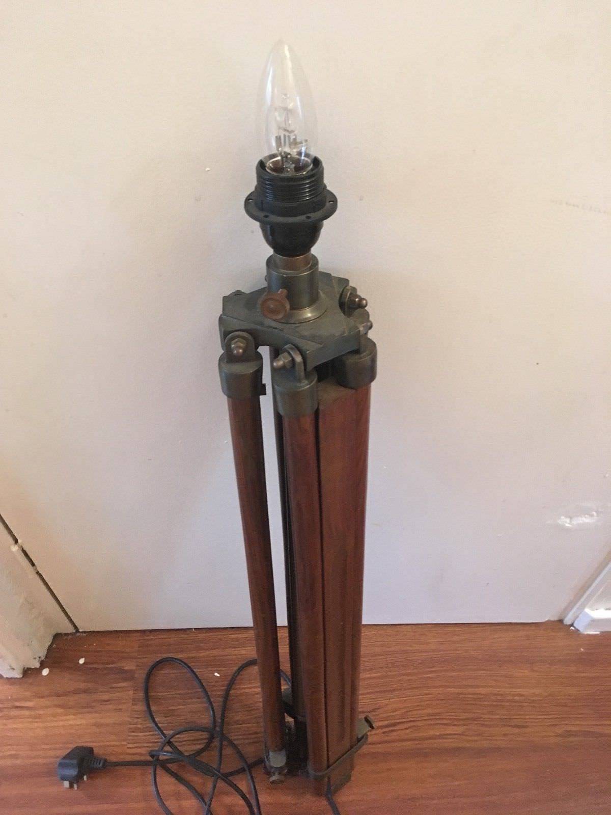 Title (ebay affiliate link): VINTAGE WOODEN/BRASS HEAVY DUTY TRIPOD LAMP FULLY ADJUSTABLE