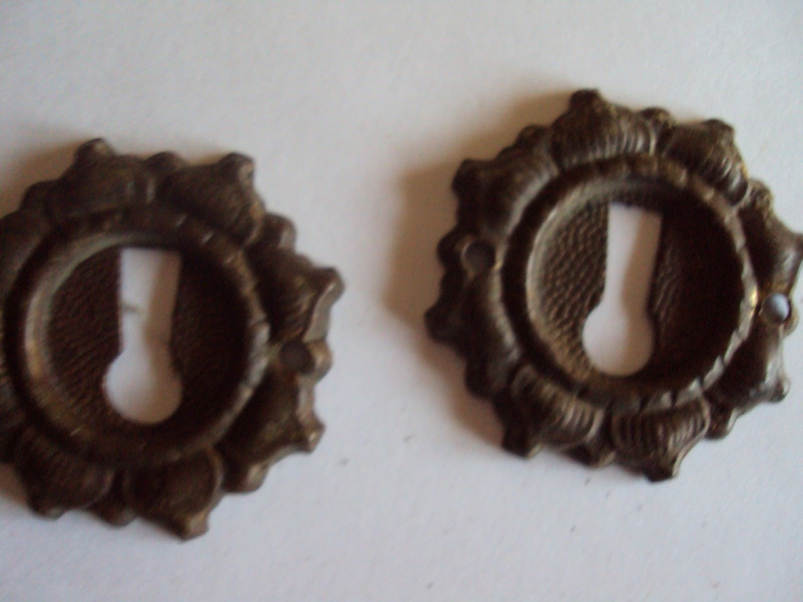 Title (ebay affiliate link): 2 Antique Old Fancy Ornate Metal KEY HOLE COVERS ESCUTCHEONS Furniture Hardware