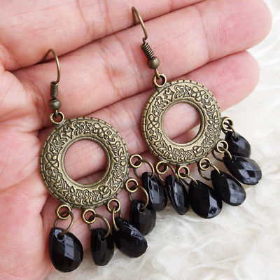 Title (ebay affiliate link): Vintage Womens Antique-Brass-Tone Black Plastic Beads Dangle Drop Hook Earrings