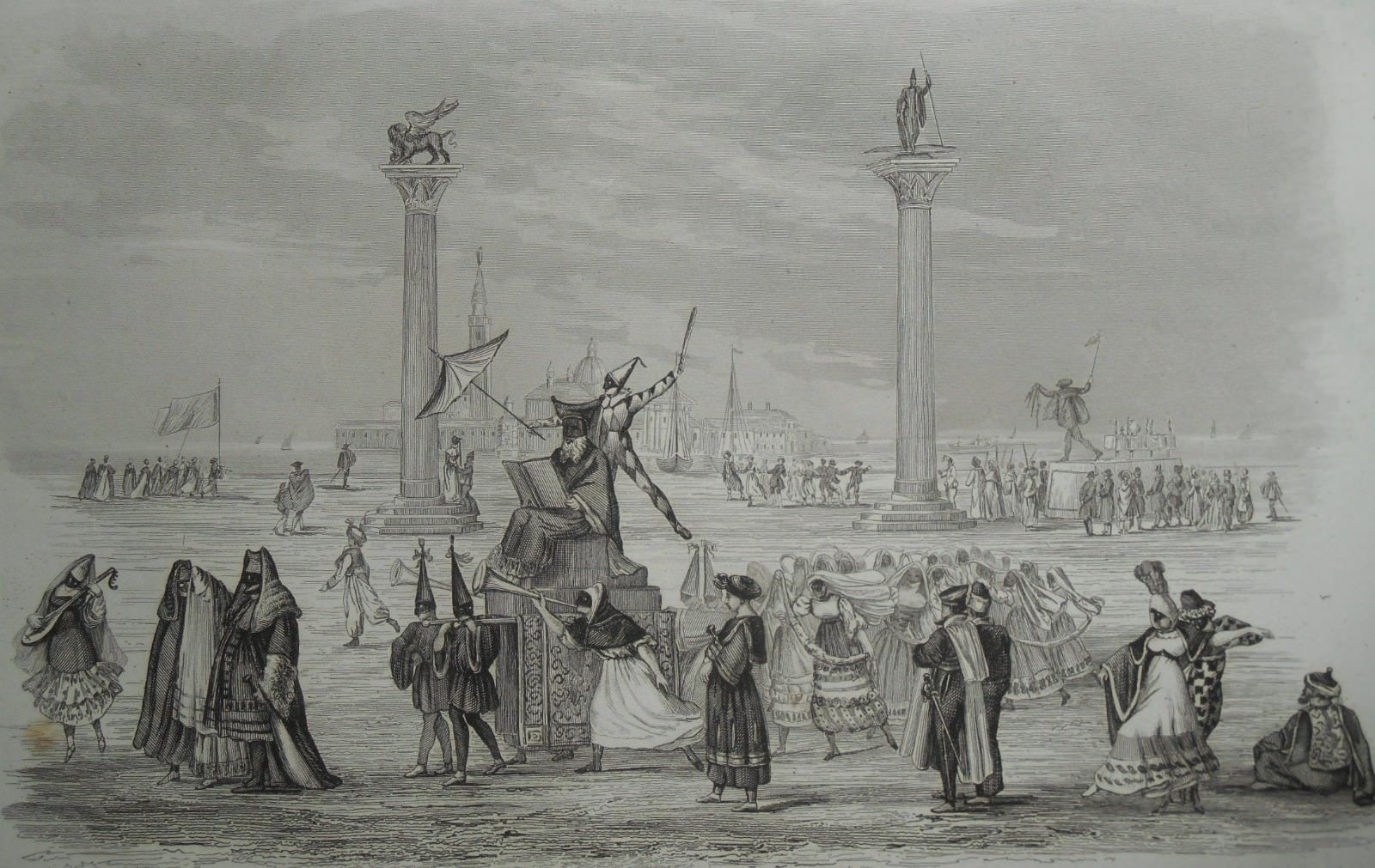 1840s GRAVURE ITALY VENICE CARNIVAL HARLEQUIN COMMEDIA DELL''ARTE ST MARKS SQUARE