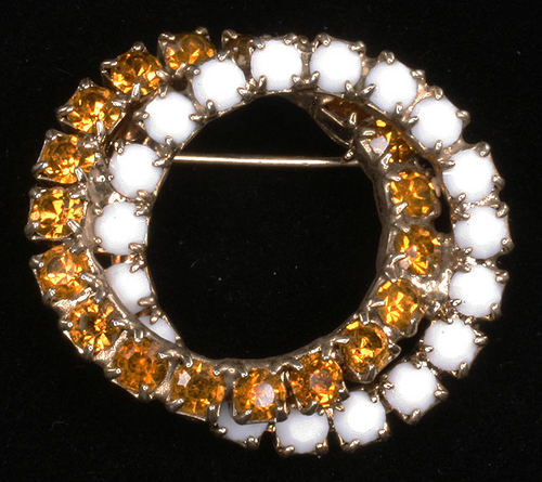 VINTAGE DECO MILK GLASS ORANGE RHINESTONE BROOCH PIN NR