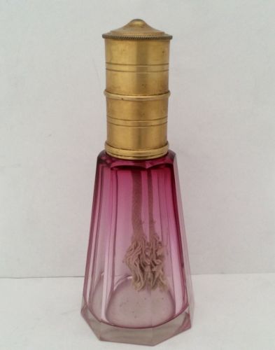 Title (ebay affiliate link): Rare Antique French Cranberry Cut Glass Travel Oil Lamp Gilt Brass Snuffer C1900