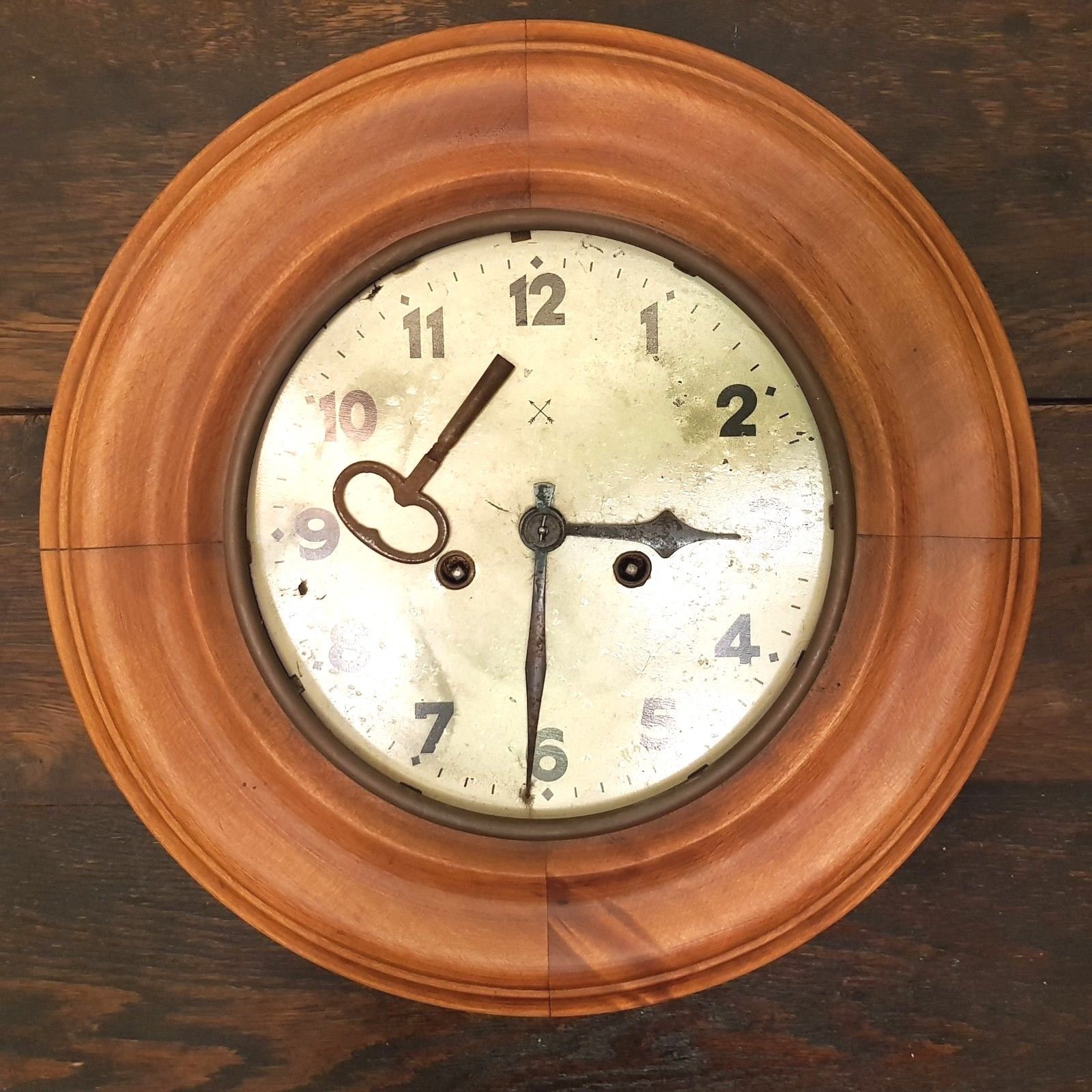 Title (ebay affiliate link): Antique Round Wall Clock Key Wind Metal Dial W/ Brass Pendulum Wood HAC? German?
