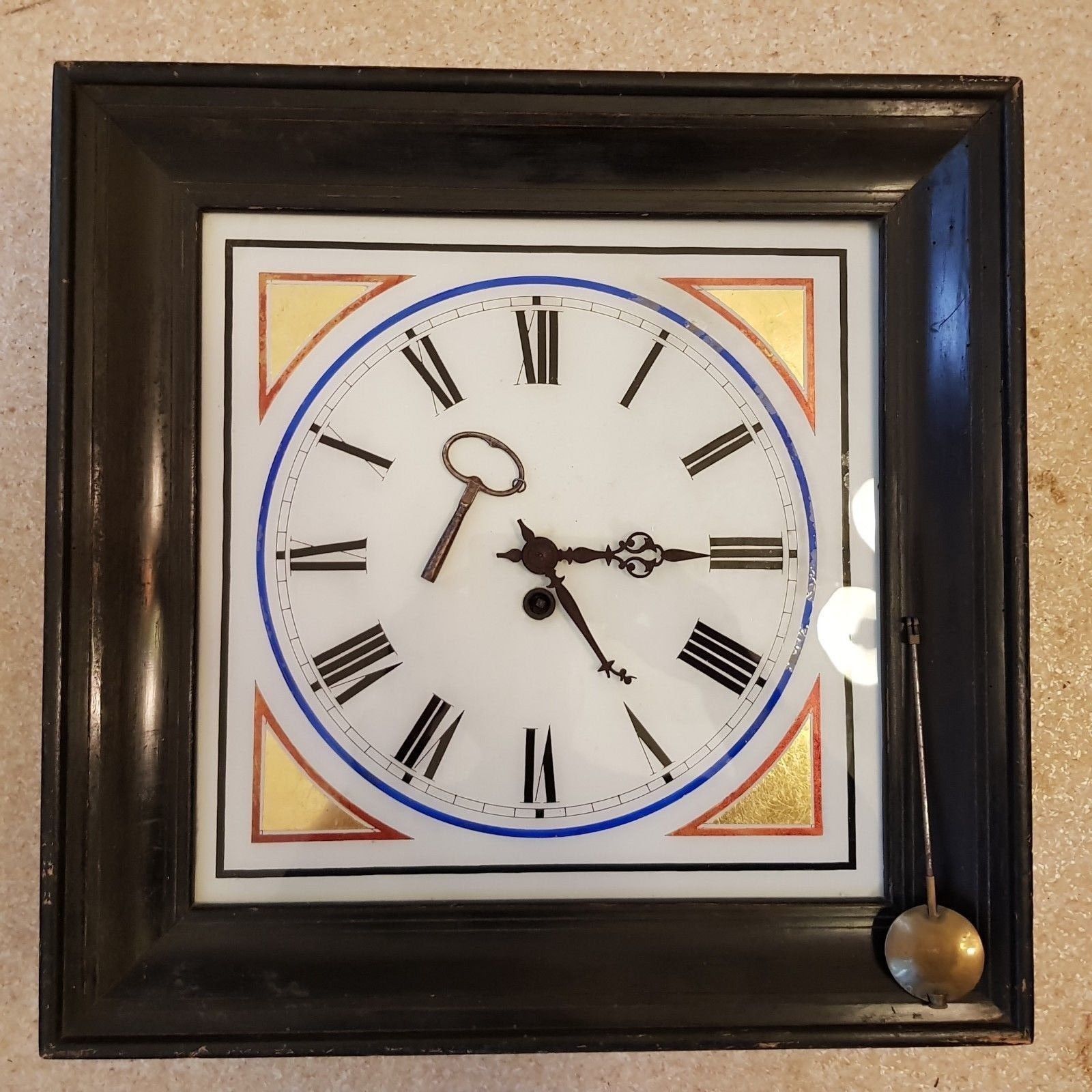 Title (ebay affiliate link): 1800s Antique Key Wind Brass Pendulum Kitchen Farm Stenciled Primitive Clock