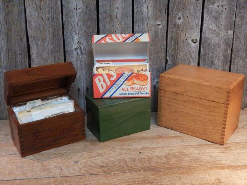 Title (ebay affiliate link): 4 Old Vintage Kitchen Recipe File Box Lot Wood & Metal with Recipes