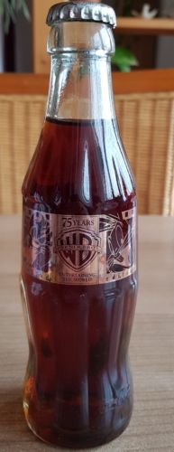Title (ebay affiliate link): Coca Cola ACL glass bottle from germany. Gold Letters Warner Bros 75 years rare