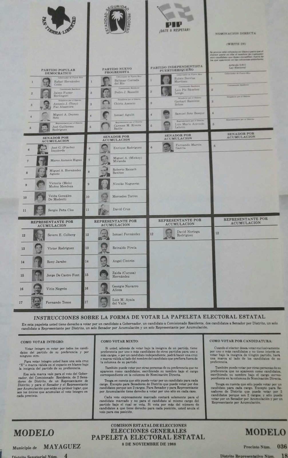 Papeleta elecciones votacion Puerto Rico 1988 gobernador/ballot voting election