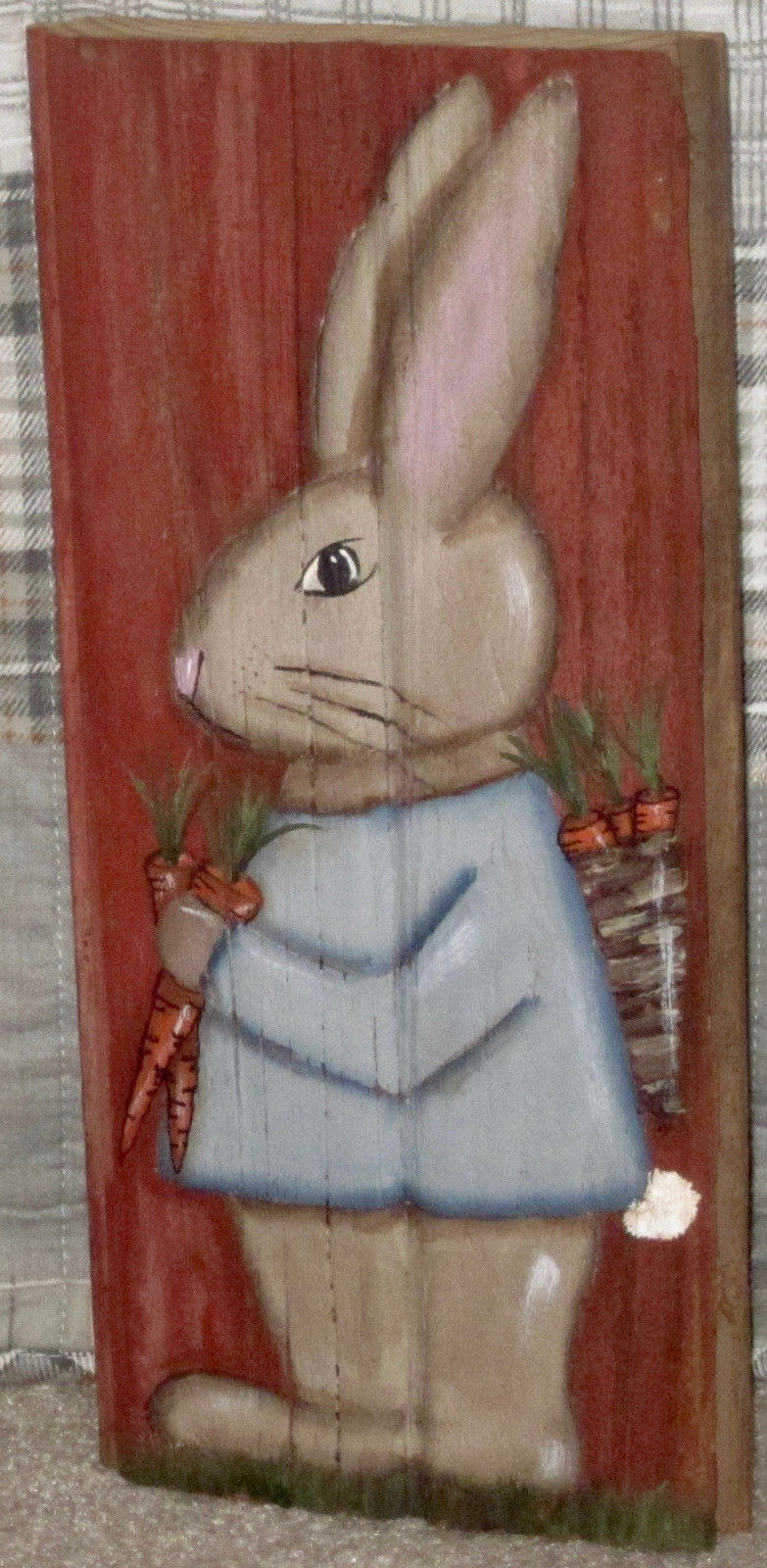 Title (ebay affiliate link): *~*PRIMITIVE*~*HP FOLK ART PRIM CHUBBY BUNNY *~* CARROTS *~* OLD RED BARN WOOD