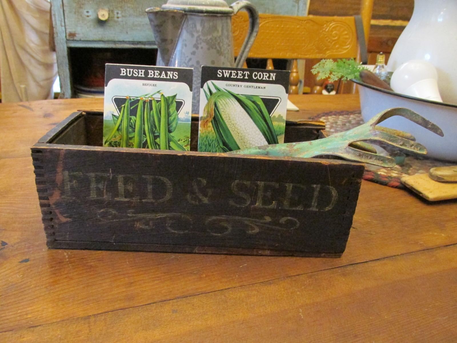 Title (ebay affiliate link): ANTIQUE PRIMITIVE WOODEN BOX WITH OLD SEED PACKS AND GARDEN TOOL