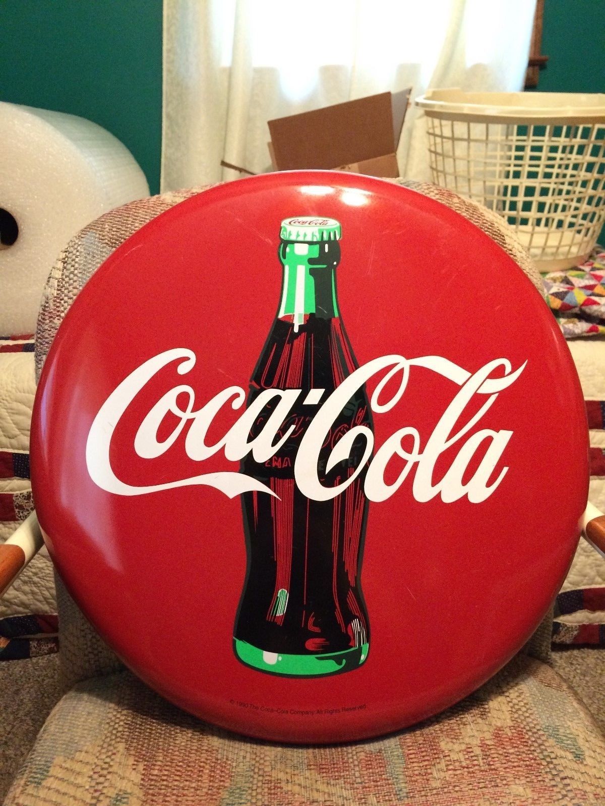 Title (ebay affiliate link): 16" Vintage Antique 1990 Coke Coca Cola Tin Non Porcelain Button Soda Sign USED